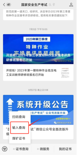 方式二:微信搜索并關(guān)注官方微信公眾號(hào)“國(guó)家安全生產(chǎn)考試”,點(diǎn)擊證書(shū)查詢→輸入查詢,查詢證書(shū)信息及復(fù)審時(shí)間。