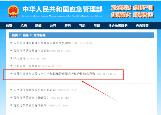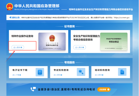 步驟 1:點(diǎn)擊“特種作業(yè)操作證及安全生產(chǎn)知識(shí)和管理能力考核合格信息查詢”。