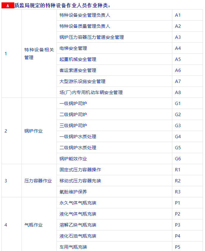 特種設(shè)備安全管理人員、叉車司機(jī)、起重機(jī)司機(jī)、起重機(jī)指揮、壓力容器、鍋爐、氣瓶充裝、電梯安裝與維修、觀光車、客運(yùn)索道操作與修理、大型游樂設(shè)施操作與維修等等。